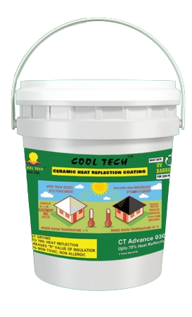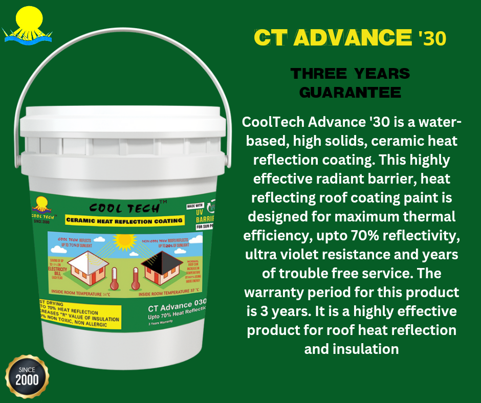 CoolTech Advance '30 is a water-based, high-solids, ceramic heat reflection coating. This highly effective radiant barrier and heat-reflecting roof coating paint is designed for maximum thermal efficiency, with up to 70% reflectivity, UV resistance, and years of trouble-free service. The warranty period for this product is 3 years. It is a highly effective product for roof heat reflection and insulation.
