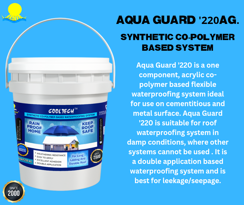 Aqua Guard '220 is a one-component, acrylic co-polymer-based flexible waterproofing system ideal for use on cementitious and metal surfaces. It is suitable for roof waterproofing in damp conditions where other systems may not be applicable. Aqua Guard '220 is a double-application-based waterproofing system that is highly effective in addressing seepage issues.
